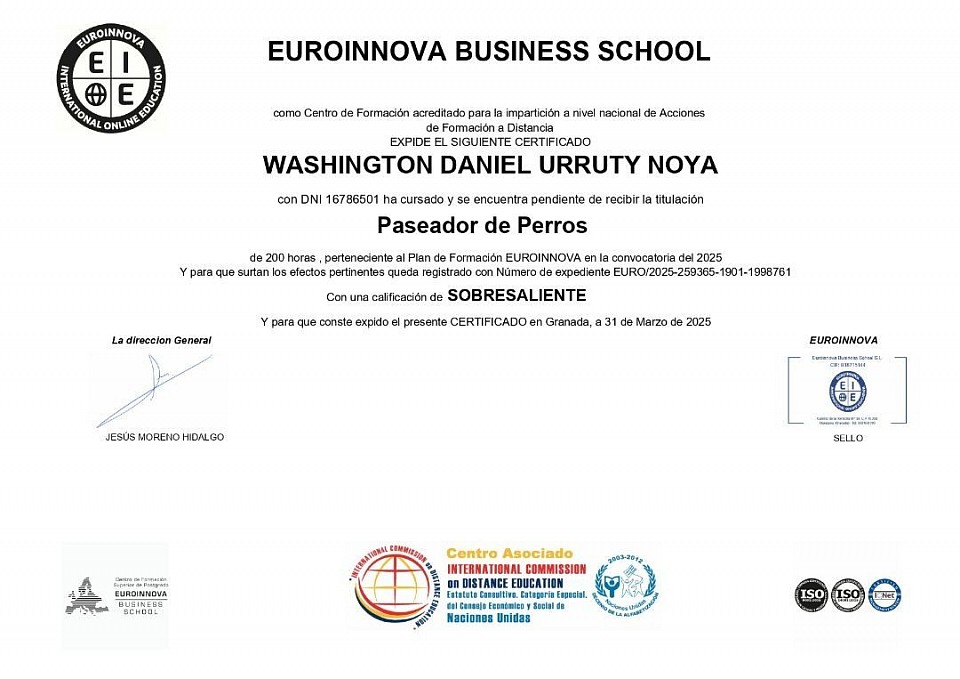 Soy titulado como paseador de perros en "EUROINNOVA".